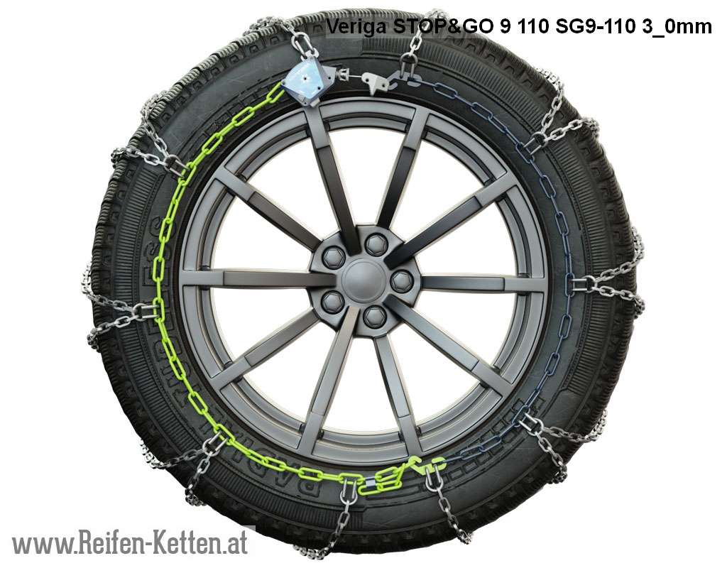 Kette, 9 mm, mit automatischem Spannsystem und selbstständiger Anpassung der Kette an den Reifen. Ein patentierte »STOP&GO« Schlösser mit Selbstspannfunktion gewährleisten ein automatisches Nachspannen der Kette selbst während der Fahrt.